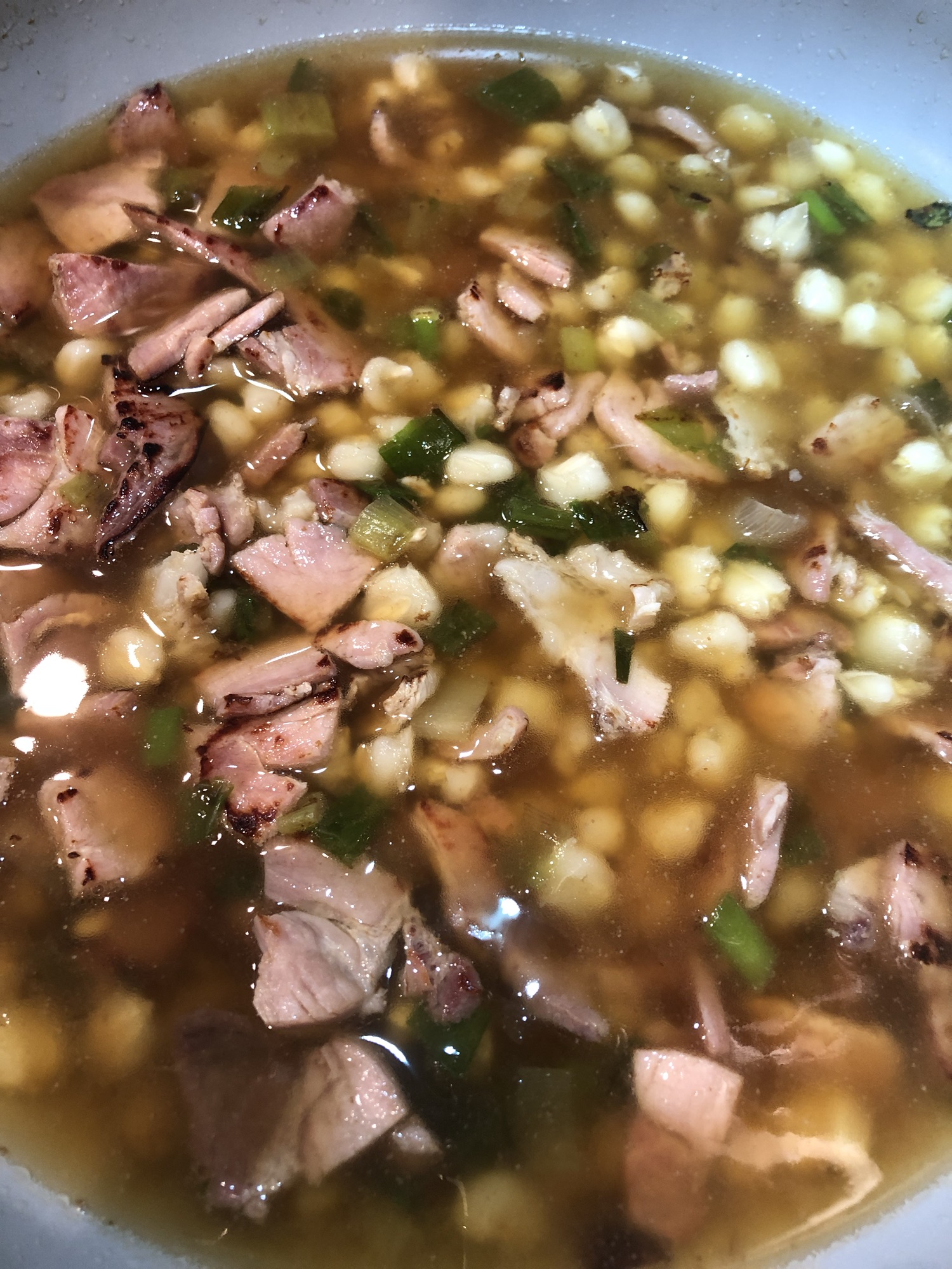 Ham and hominy soup is a southern and midwestern dish made of hominy and whatever ham or pork people have in their homes. Common pork used for ham and hominy soup is ham, hammocks, pork belly, and pork shoulder. Some families have a tradition of using left over holiday ham to make hominy soup, and some people eat it with corn bread or tortillas. However you decide to dig into this dish is it full of flavor and delicious.